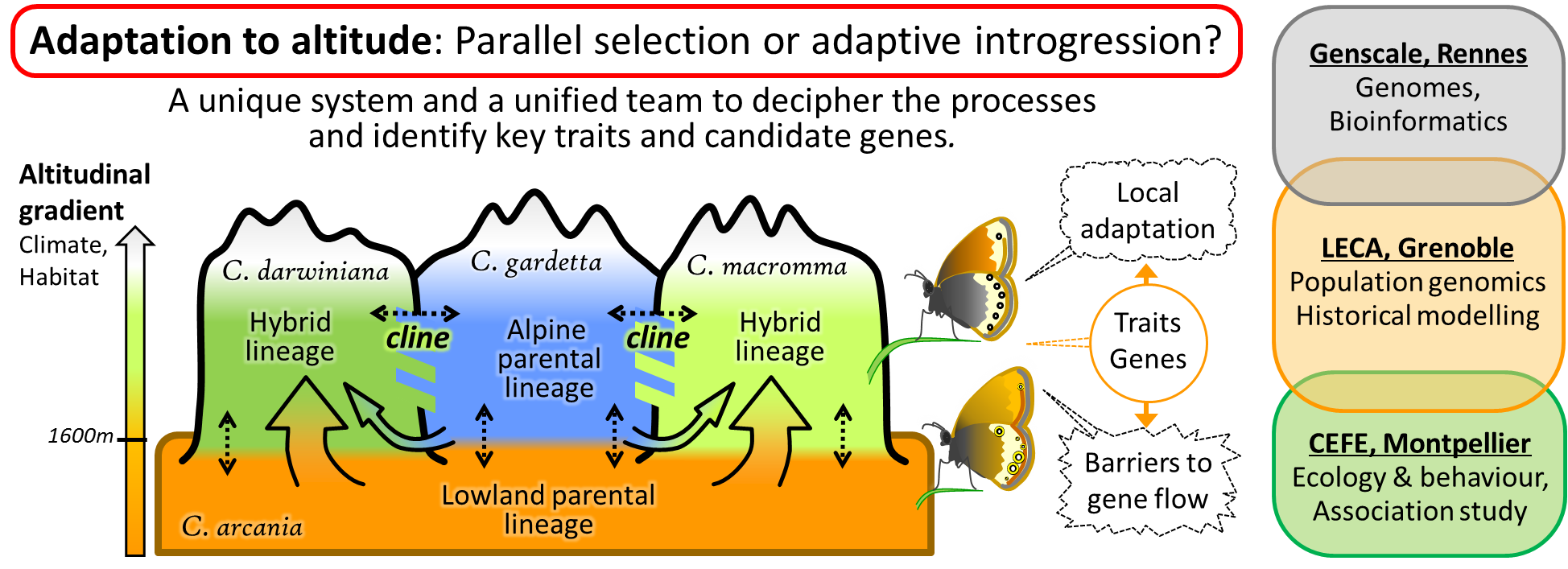 Here we focus on a complex of butterfly species distributed along the altitudinal gradient, and with different histories of altitudinal adaptation, to understand how populations adapt to higher elevation. We will analyse genomes of butterflies in contact zones to identify introgressions and rearrangements between taxa, i.e. regions more or less permeable to gene flow, and associate them with adaptive phenotypic variation. By using hybrid taxa originating from ancient hybridization, we will untangle the effects of genome-wide differentiation due to allopatry and demography from those of selection on genes involved in local adaptation and reproductive isolation. We will reveal to what extent these genes were exchanged between lineages. To understand how the key traits conferring altitudinal adaptation are shared by introgression among alpine lineages or act as barriers to gene flow, we will use admixed populations in contact zones, taking advantage of a natural recombination experiment allowing the segregation of the phenotypic traits characterising each taxon through many generations of recombination. This will allow linking traits and candidate genes with adaptation to changes in climatic and biotic conditions with altitude.