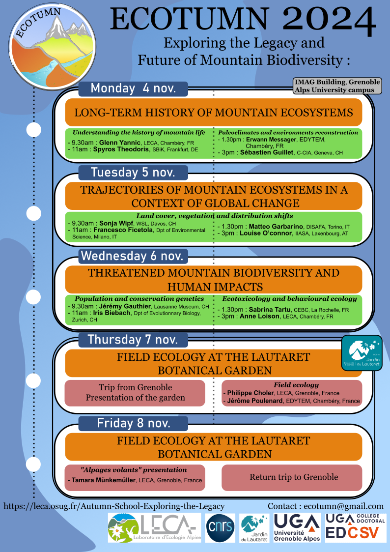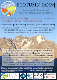 Embark on a scientific journey to the heart of mountain ecology with ECOTUMN, a research school organized by PhD students at the Alpine Ecology Laboratory in Grenoble, France, from November 4 to 8, 2024. This immersive program is designed for PhD students interested in the study of mountain ecosystems in the broadest sense.