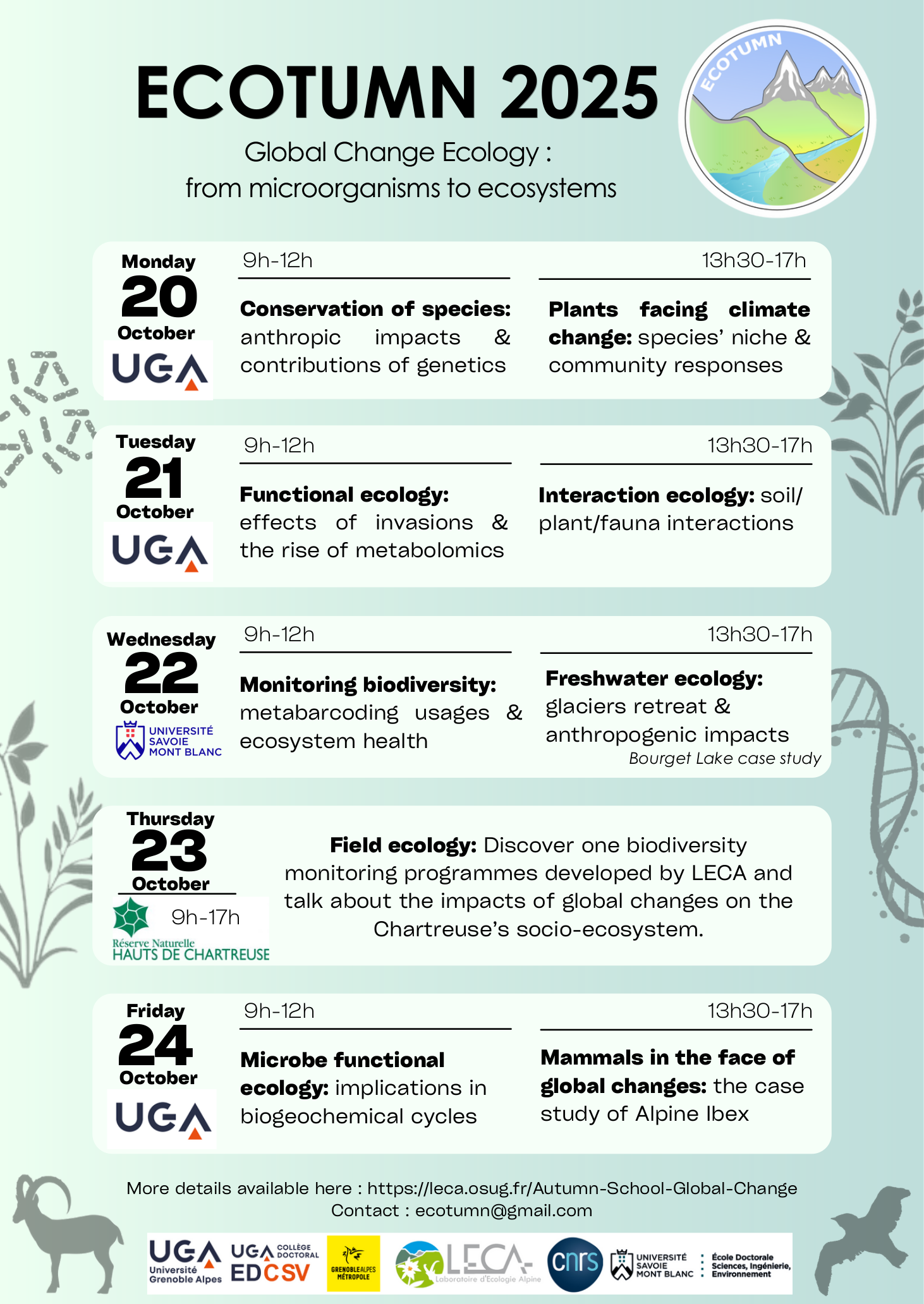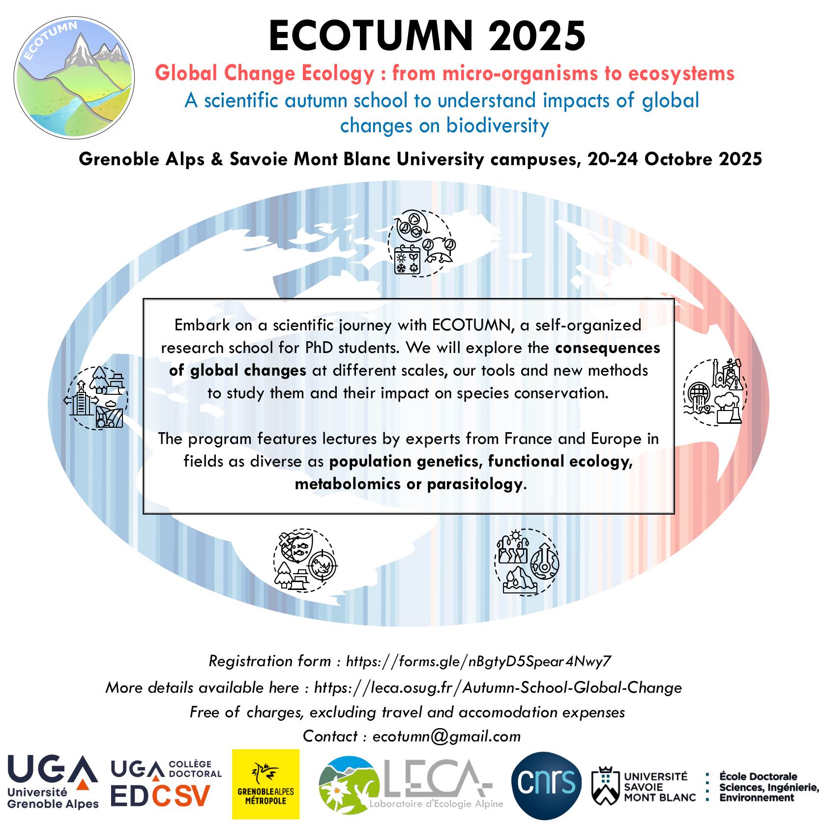 This event is open to all young researchers in ecology (PhD students and postdoctoral researchers). We particularly thank the LECA and the doctoral schools "Chimie et Sciences du vivant" and "Sciences, Ingéniérie, Environnement" for funding our project.