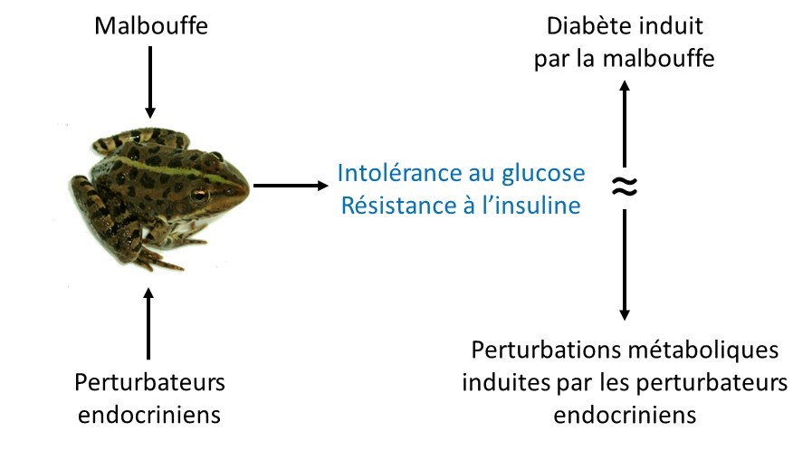Au cours de ces dernières décennies, l’augmentation des activités humaines a entraîné l’exposition des populations animales à des milliers de polluants. Parmi les milieux aquatiques d’eau douce, les zones humides sont des écosystèmes complexes dans lesquels les xénobiotiques s’accumulent. Dans ces milieux, un déclin dramatique des populations d’amphibiens a été observé au niveau mondial depuis les années 80. Des études récentes menées à l’Université de Grenoble Alpes ont démontré chez une espèce modèle d’amphibien (Xenope tropicalis) que les perturbateurs endocriniens (PE) pouvaient induire un syndrome de pré-diabète pouvant constituer une cause potentielle du déclin des populations d’amphibiens. Cependant, de tels effets n’ont pas été constatés chez les grenouilles de type sauvage exposées aux PE et la capacité des amphibiens à développer physiologiquement un diabète de type 2, comme les mammifères, n’a jamais été démontrée.