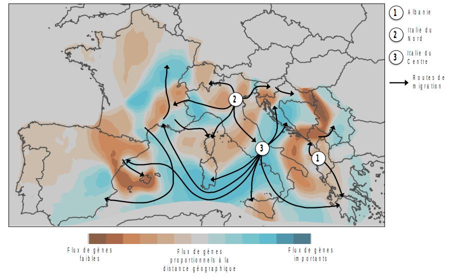 Le fond de carte représente les résultats d’un modèle de génétique des populations intégrant la géographie des populations analysées afin d’identifier des barrières (zones marrons) et des corridors (zones bleues) pour la dispersion. Les chiffres représentent la localisation des trois premières zones d’introduction en Europe dans l’ordre chronologique (respectivement 1979, 1990, et 2000). Les flèches représentent les routes de migration inférées à partir des données génétiques et des données historiques à l’aide d’une méthode Bayésienne quantifiant la probabilité d’avoir identifié la bonne origine de la population.