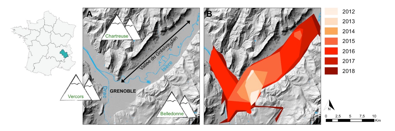 A : carte montrant les trois vallées de part et d’autre de Grenoble et B : limites de distribution globale par année depuis son introduction en 2012, montrant uniquement le front d’expansion (les zones non habitées au sein de ces étendues ne sont pas représentées).