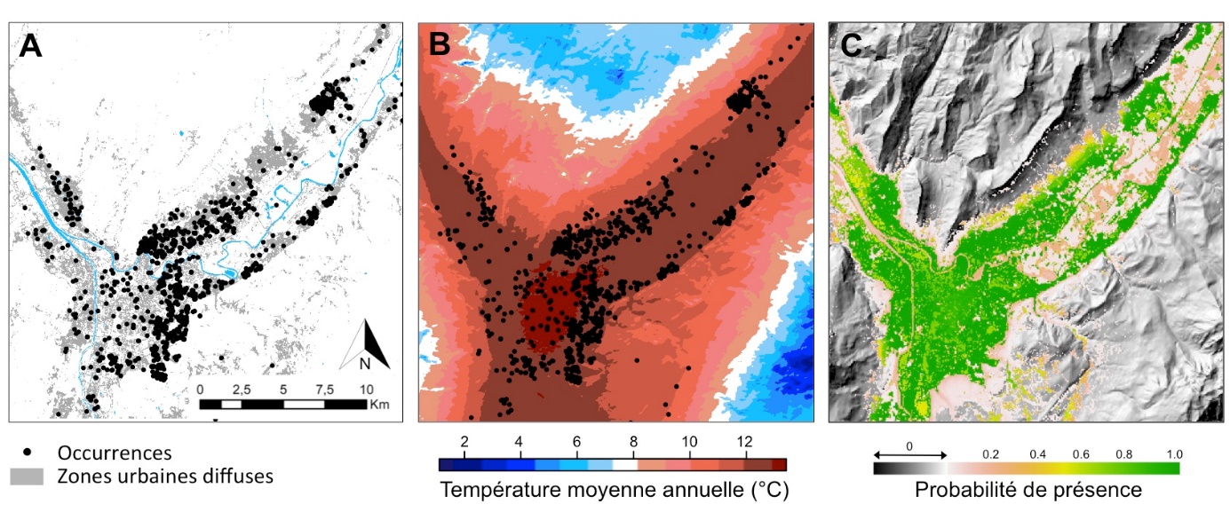C : probabilité de présence du moustique tigre à partir des zones actuellement occupées (points noirs sur A et B) représentant les aires où l’espèce peut s’établir avec certitude (1) et celles où elle est absente (0).