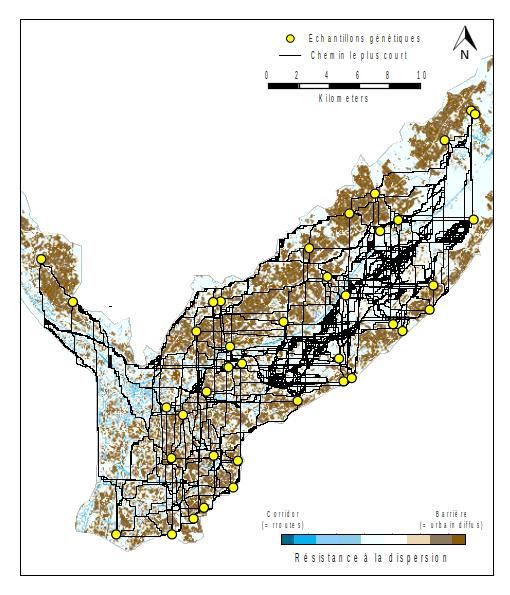 Les zones en bleu foncé, représentant des corridors pour la dispersion, sont situées sous les chemins noirs représentant les chemins de moindre coût à travers le paysage Grenoblois. Ainsi les populations de part et d’autre (points jaunes) de ces chemins sont génétiquement très proches, suggérant que le transport routier favorise les flux de gènes. Les zones urbaines résidentielles (en marron) représentent des freins à la dispersion.