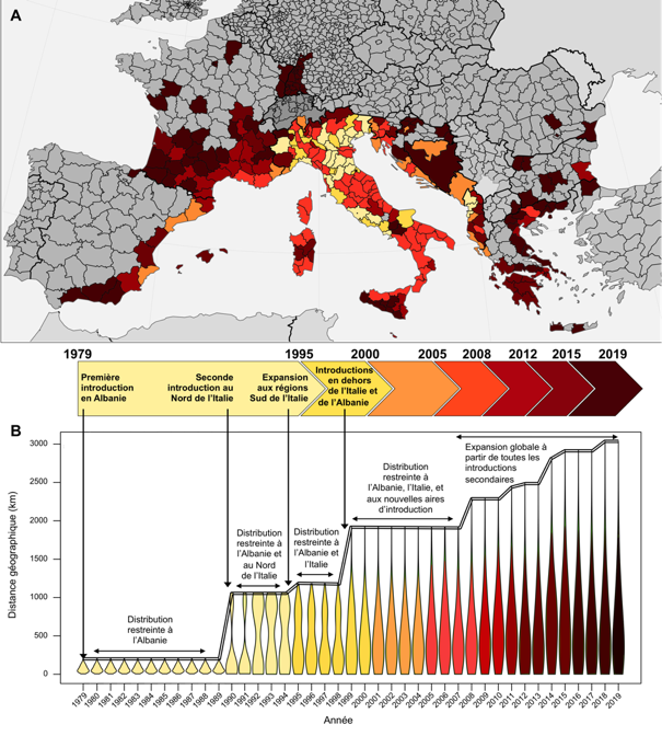 A : Distribution géographique au cours du temps. La couleur des unités de la carte représente les dates d’introduction, seulement pour les régions où il est reconnu comme établi (source des données : ECDC). Gris : absence de l’espèce ou absence de données.