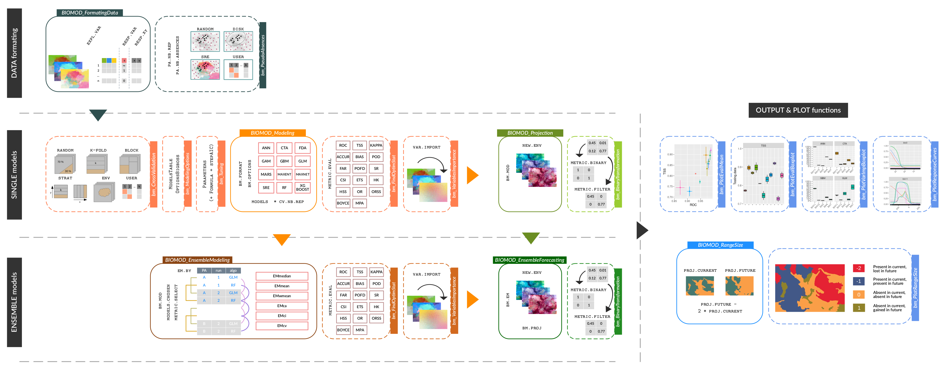Thuiller W. (2003). BIOMOD : Optimising predictions of species distributions and projecting potential future shifts under global change. Global Change Biology, 9, 1353-1362. PDFThuiller, W., Lafourcade, B., Engler, R., & Araujo, M. B. (2009). BIOMOD – A platform for ensemble forecasting of species distributions. Ecography, 32, 369-373. PDF